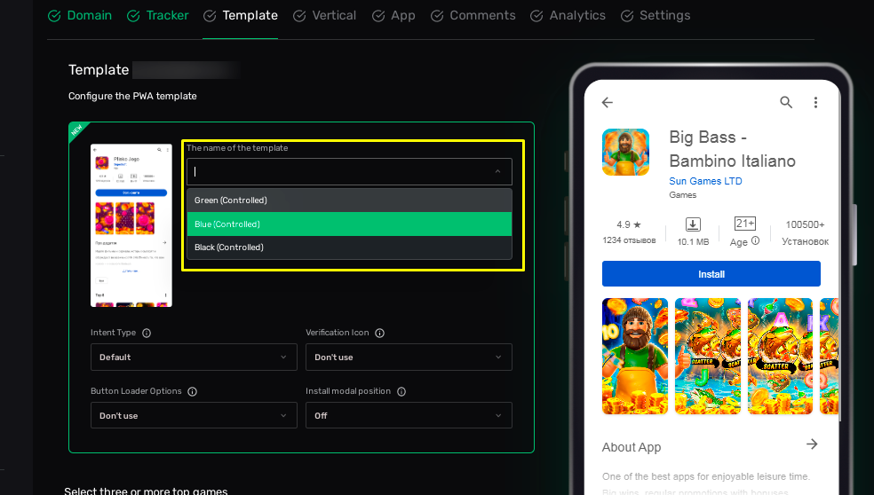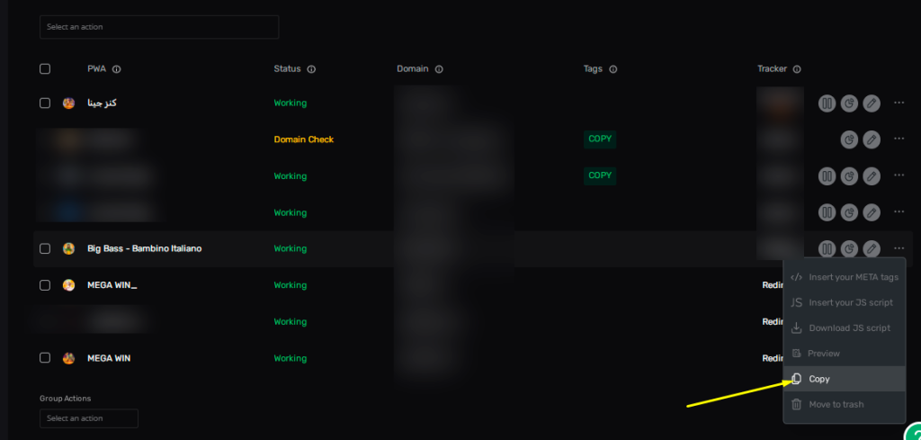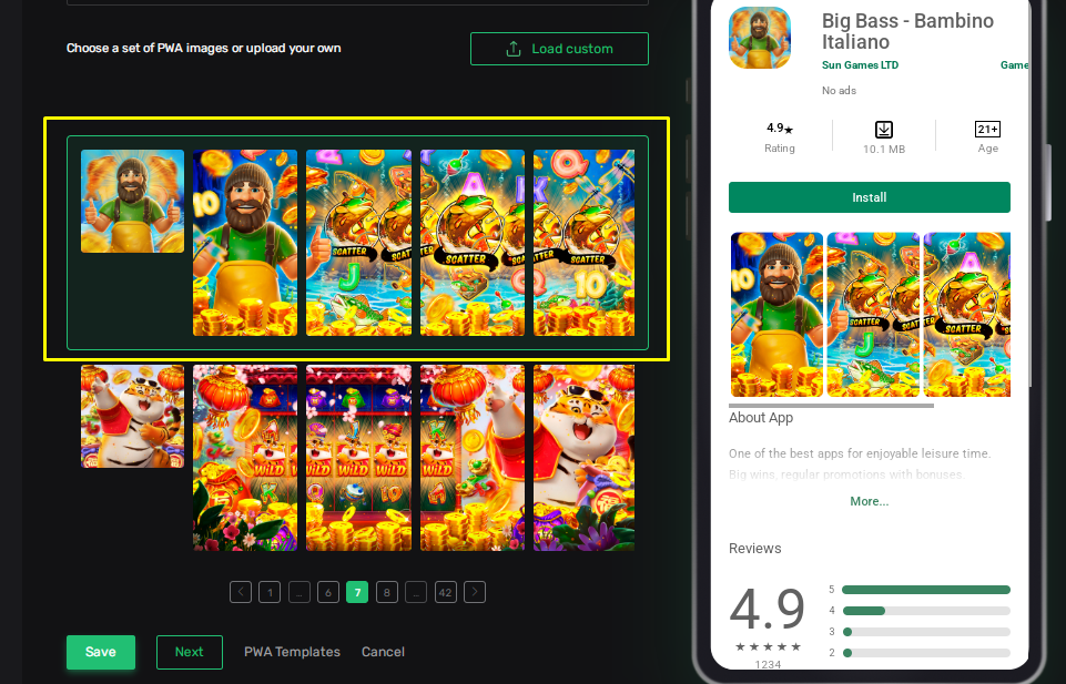 Представим рабочий процесс. Нейронка создала крео с бонусом под популярный слот «Big Bass» в типичном для этой игры стиле. Чтобы воронка сработала, PWA должна выглядеть как прямое продолжение этого креатива. Для этого веб в личном кабинете PWA Group выбирает из списка уже активных приложений самое удачное PWA и жмет кнопку «Копировать».