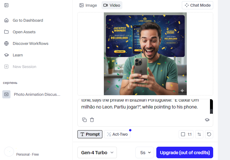 Вместо того чтобы мучительно расписывать дизайнеру техзадание, теперь достаточно набросать идею для нейронки. Тут не нужно быть гением промптов. Дальше все решают детали. Главное, чтобы картинка била в цель. Например, для Бразилии отлично сработает визуал, где их соотечественник, мужчина средних лет, выигрывает джекпот в Plinko. А чтобы игрок поверил, можно попросить нейросеть дорисовать на экране телефона поп-ап с конкретной суммой, скажем, R$34 879. Такой реализм и местная валюта действительно вызывают доверие у аудитории. Условный Midjourney, Leonardo.ai, Chat GPT, FLUX или любая другая нейронка, поймет задачу с полуслова. Через несколько минут она выдаст вебу пачку уникальных крео, на которые дизайнер убил бы целый день. Когда исходники готовы, добавляем на них текст с кнопкой. Все, крео готов к тестам. Так можно тестить не по 2-3 вылизанных креатива в день, а целые пачки разных даже самых безумных идей, на которые дизайнер вообще вряд ли бы согласился.
