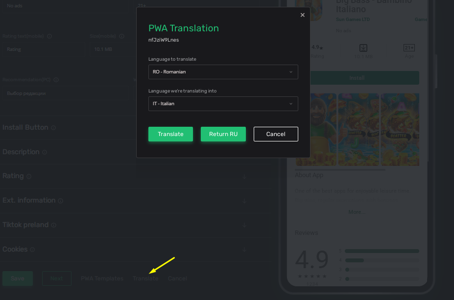 Если нужно локализовать приложение под тот же оффер, но в другом гео, на этапе тестов можно воспользоваться встроенной функцией ИИ-перевода. На этапе тестов это очень выручает. Позже можно заказать полную локализацию перевода у нейтив спикера. Но на создание нескольких разных версий прилы с конструктором реально уйдет всего 10-20 минут.