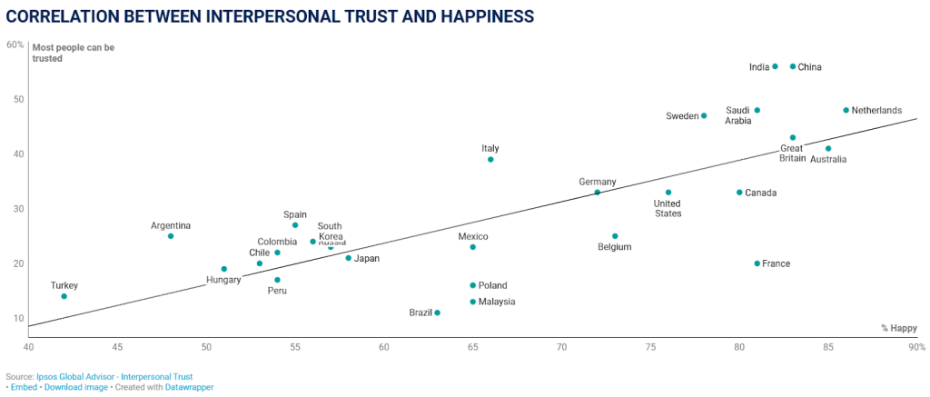 Если верить статистике, то уровень доверия людей зависит от того, насколько они счастливы и уверены в своем финансовом будущем. Например, в Индии 82% людей считают себя счастливыми, поэтому 56% из них заявляют, что большинству людей можно доверять.
