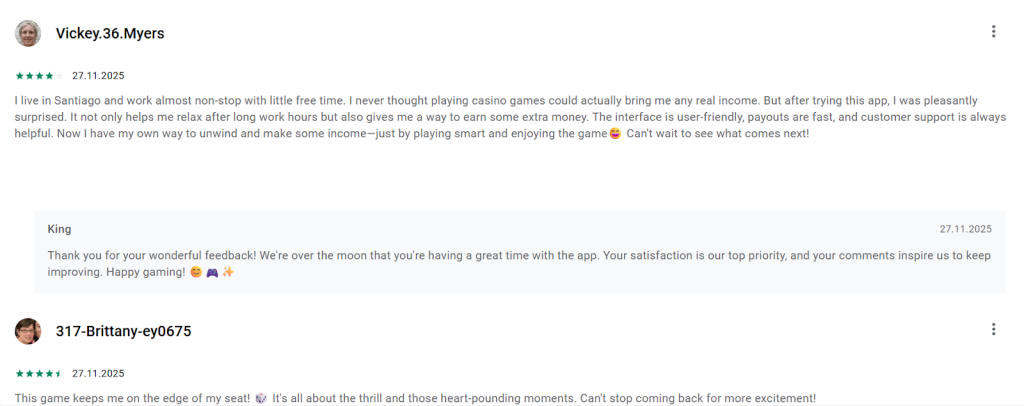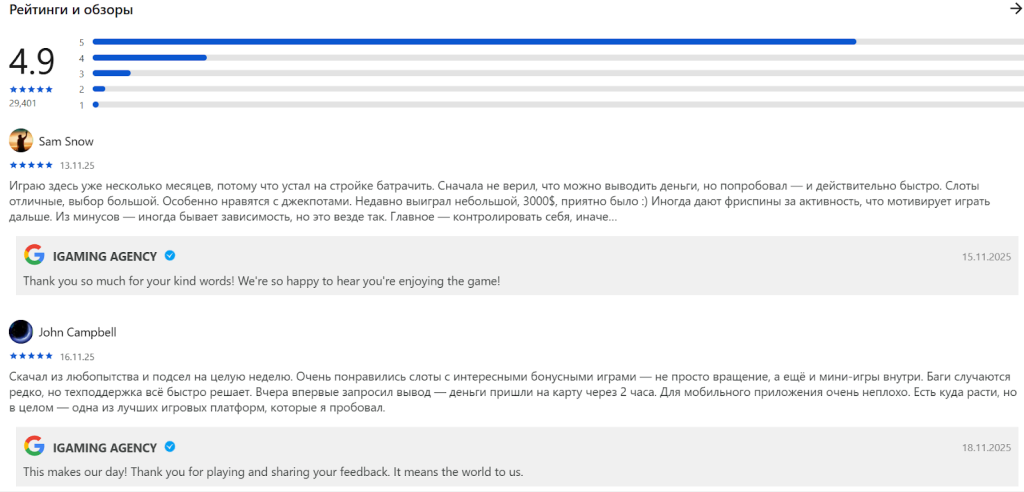 В отзывах. Если на креосе заявлен победитель с суммой джекпота, то эту же мысль желательно продолжить в отзывах. Пользователь почти гарантированно заглянет туда: порядка 77% юзеров читают хотя бы один отзыв перед скачиванием приложения. Поэтому разместить первым отзыв с историей везунчика — надежный способ привлечь к нему внимание.