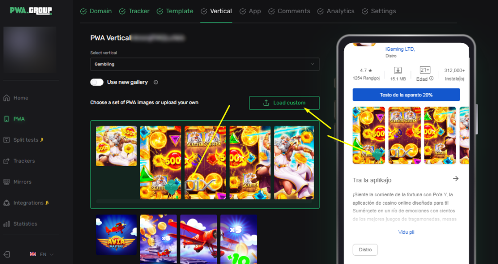 - Интеграция лого платежки в дизайн. Не стоит прятать иконку условного PIX или M-Pesa в футере PWA-прилы или преленда. Лучше сделать ее частью основного баннера или всего дизайна аппки. В конструкторе PWA Group можно не только выбирать готовые шаблоны, но и загружать собственные кастомные дизайны. Как раз такая опция дает возможность создания визуала, где лого местной платежки органично вплетен в общую концепцию. Так локальная платежка становится одним из центральных элементов, который помогает формировать доверие потенциального гемблера еще до регистрации;