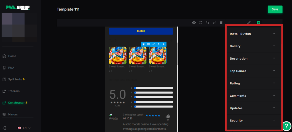 Новый функционал, реализованный в PWA Group, решает эту проблему через полную гибкость структуры. Если веб видит, что на целевых устройствах его аудитории (например, популярных в Азии бюджетниках Samsung) интерфейс смещен, он может редактировать шаблон, просто перетащив блок с кнопкой немного ниже под большой палец пользователя, и изменив порядок элементов. После этого можно применить шаблон к приложению, не останавливая РК. Это напоминает игру в конструктор Lego, только веб собирает интерфейс, который идеально ложится в руку потенциального гемблера.