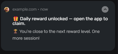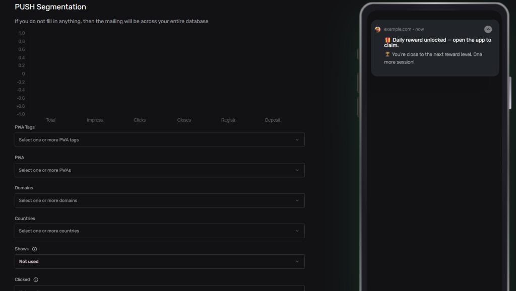 Со встроенным инструментом для рассылки пушей в PWA Group можно в разы проще разделять эти когорты по разным версиям приложений, доменов и другим критериям. Например, игрокам помоложе автоматически отправляем дерзкие сообщения с кучей эмодзи, а старшей аудитории – сдержанные, персонализированные пуши о начислении индивидуального бонуса.